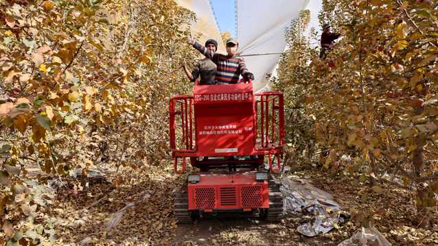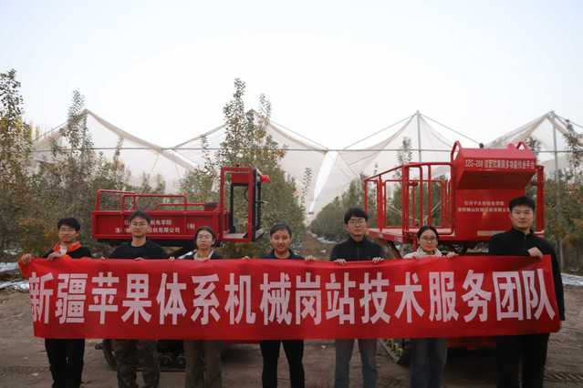 2025 年 10 月26 日至11月 10 日,色情网站 、新疆苹果产业体系果园机械化技术与装备岗李景彬教授团队赴第一师五团开展自主研制的两款自走式多功能采摘平台技术推广与现场演示活动。